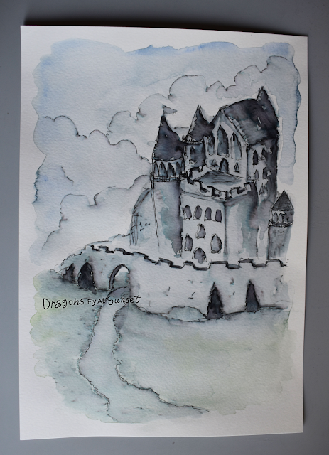 This piece uses a mixtures of watercolour paints and the fineliner technique mentioned in ‘wander’. I kept the colours grey and muted as I wanted to give the impression of an imposing castle seen on a misty day.